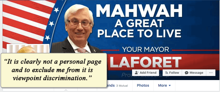 Mayor Laforet went on the record at the March 22nd Mahwah council meeting saying “I can block whomever I want” since, as he claims, it is his personal page. However, Mr. Musco challenged the assertion that the page is “personal” because it is regularly used to post township information, emergency notices and even the banner across the top touts Laforet’s role as “Your Mayor.” “It’s clearly not a personal page and to exclude me from it, is considered viewpoint discrimination,” said Musco.
