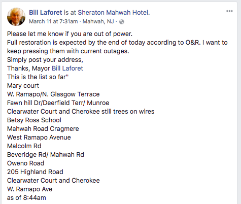 Mahwah Mayor Bill Laforet used his personal Facebook page to keep residents up to date about repair work going on in town and to get feedback from residents who were still without power. However, not all residents were able to see the information because the mayor has blocked them. Some believe that because of their opposing political beliefs or because they have been openly critical of the mayor they are being treated differently by an elected official. Long-time Mahwah resident Ralph Musco said, “As a taxpayer, I find it reprehensible that myself and other residents were blocked by our mayor during the storm and I was unable to have the same access as others to important, perhaps critical updates on Facebook. This is particularly frustrating when you consider that he has NOT blocked and even “liked” the vitriolic comments from out-of-town residents who have repeatedly and viciously maligned this wonderful town in recent months.”
