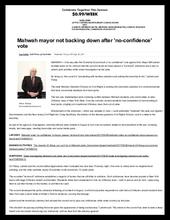 Mahwah mayor not backing down after 'no-confidence' vote Friday, September 29, 2017Publication: NorthJersey.comLink: http://www.northjersey.com/story/news/bergen/mahwah/2017/09/29/mahwah-mayor-not-backing-down-after-no-confidence-vote/718492001/