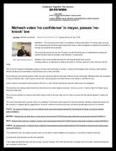Mahwah votes 'no confidence' in mayor, passes 'no-knock' law Friday, September 29, 2017Publication: NorthJersey.comLink: http://www.northjersey.com/story/news/2017/09/29/mahwah-votes-no-confidence-mayor-passes-no-knock-law/714405001/